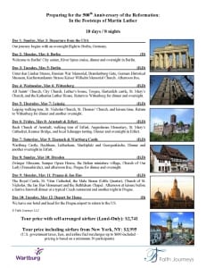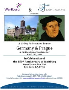 Wartburg and Faith Journeys invite you to join them on a 10-day Reformation Tour to Germany & Prague, In the Footsteps of Martin Luther, on May 3-12, 2015 in celebration of the 150th Anniversary of Wartburg. The 10-day trip will include visits to the cities of Berlin, Wittenberg, Leipzig, Erfurt and Dresden in Germany and Prague in the Czech Republic. The centerpiece of the trip will be visiting the Wartburg Castle, our namesake, overlooking the town of Eisenach in Thuringia, Germany.