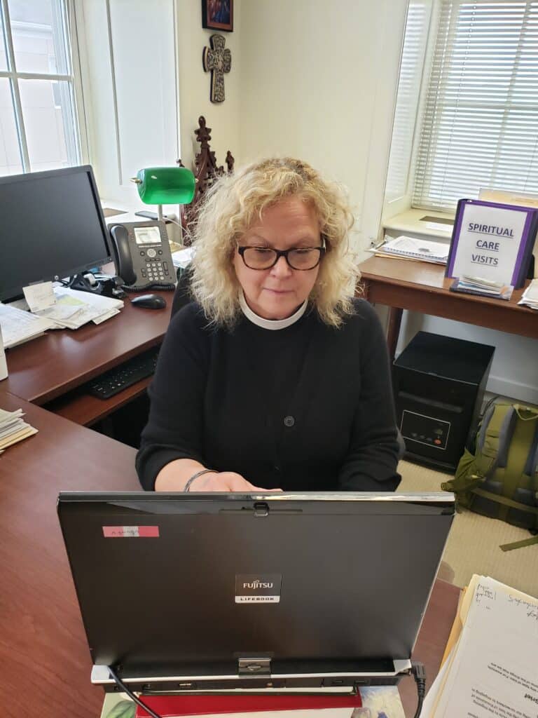 The last public worship in Wartburg Chapel was held on March 1st, 2020. Since then, Pastor Kimberli Lile, Wartburg’s Director of Spiritual Care, has been using virtual means of gathering with Wartburg residents, United Lutheran congregants, and colleagues in the Metro New York Synod of the ELCA and the Association of Professional chaplains. Here, in this photo, she prepares to meet with Wartburg’s Spiritual Care Visitors and their trainer, Carol Cella, via Zoom.