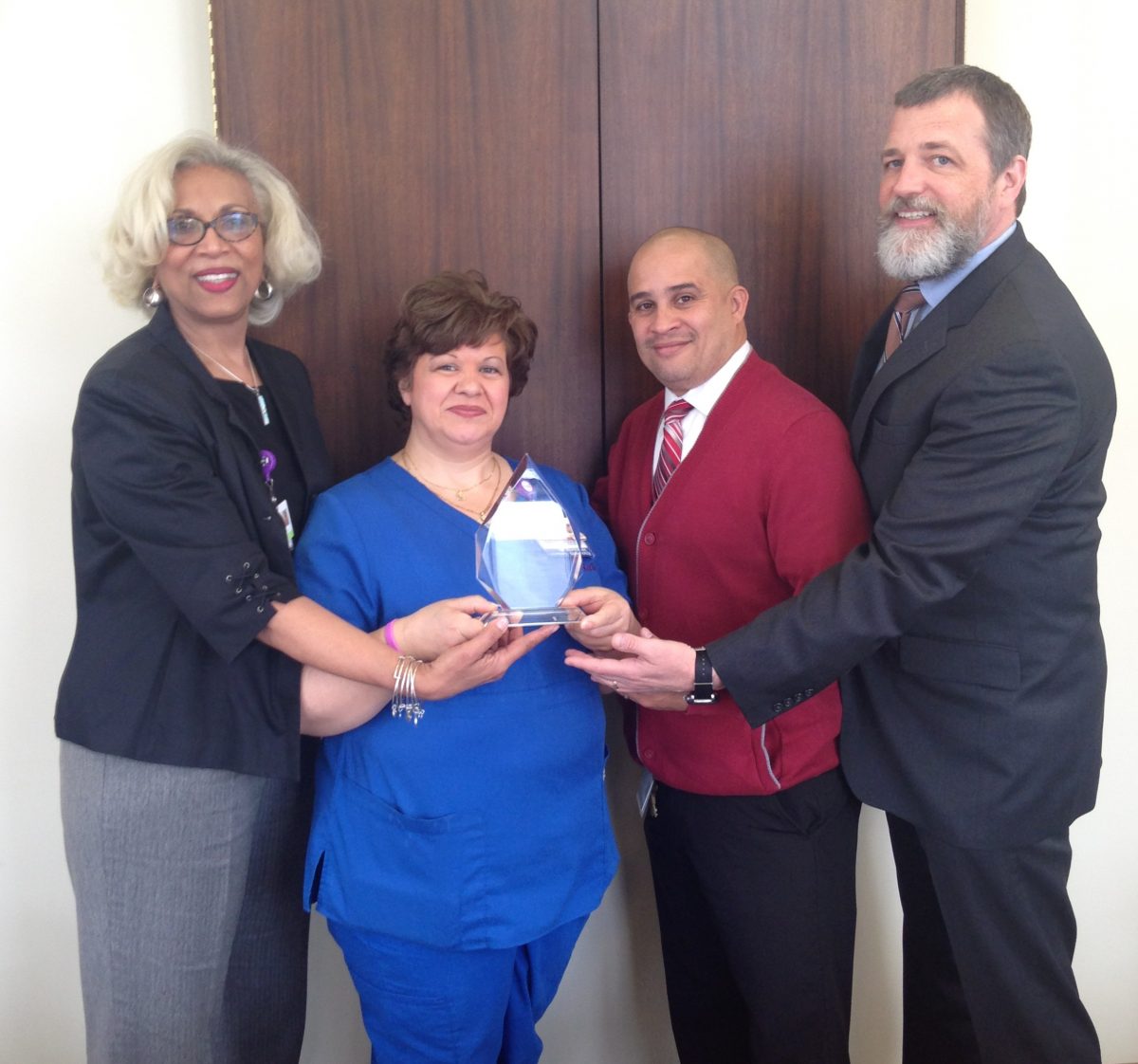 Photo (L to R): Dorothea Bell, Executive Vice President of Human Resources, Grace Carino, Environmental Services, Antonio Collazo, Director of Environmental Services, David Gentner, President & CEO.