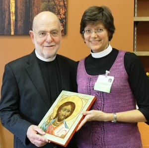 Pastor Fryer presented Father Bannan with a gift, a traditional Icon of Christ (see photo), which she painted herself, though traditionally thought of as “written.” “I will treasure this,” remarked Father Bannan. He added, “I have always appreciated Wartburg for the wonderful care that is given to our people. It is a blessing to have Wartburg in this community.”