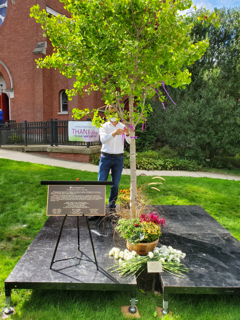 Photo caption: Tying a purple ribbon in memory of a loved one to the Robert H. Coke Memorial tree.