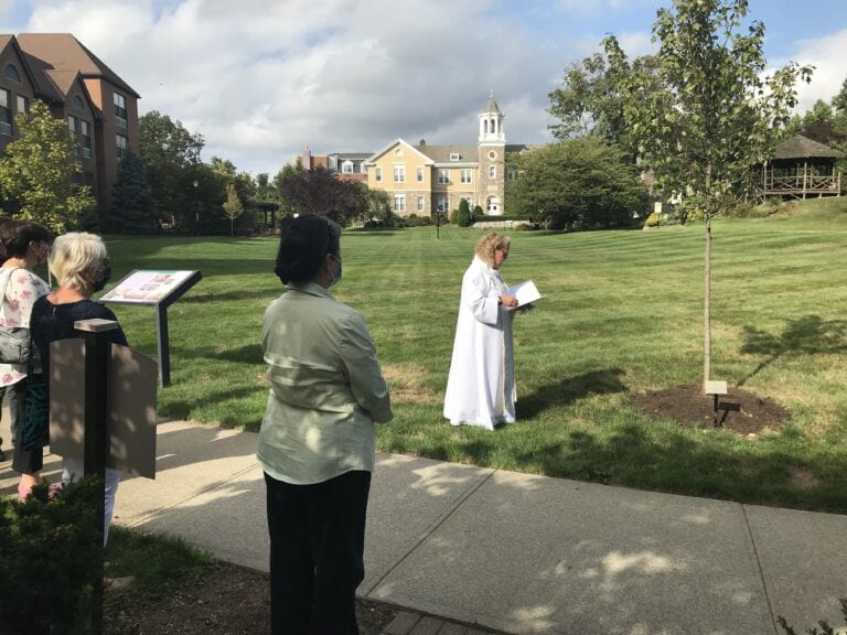 Photo caption: Reverend Kimberli Lile blessing a tree on Wartburg’s campus.