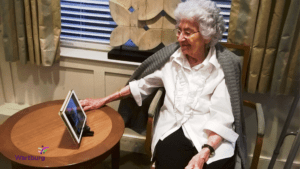 Wartburg resident having a virtual visit with family.