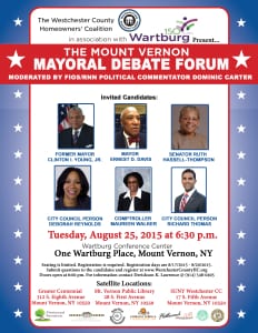 “The WCHC organization is committed to fellow homeowners and citizens of Mount Vernon to produce a debate platform that will differentiate the quality of the mayoral candidates,” said Derickson K. Lawrence, Chair of WCHC.