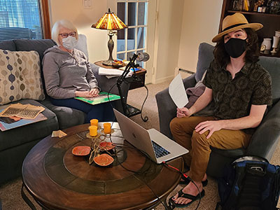 Gloria McGalagly shares with students Adam Stockman and Gwyneth Sauvage a record album—and memories—from the Choraleers, an all-female group she sang and traveled with during her college years.