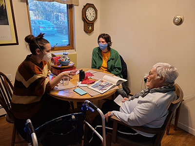 Wartburg resident Helen Byrnes flips through the pages of a photobook showcasing the home she lived in for nearly 60 years, sharing stories from each room of the house with students Annie Bingham and Sophie Hammond.